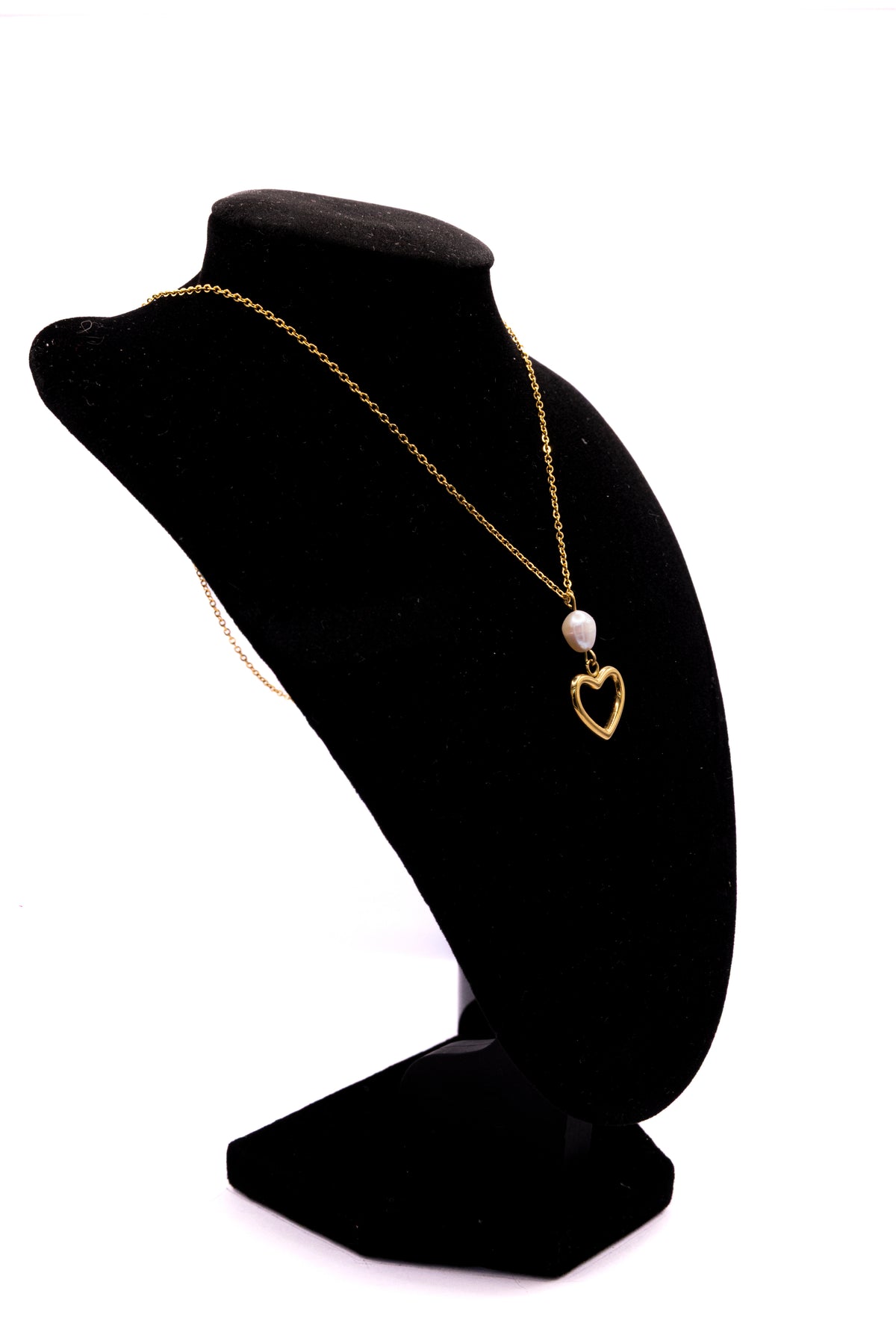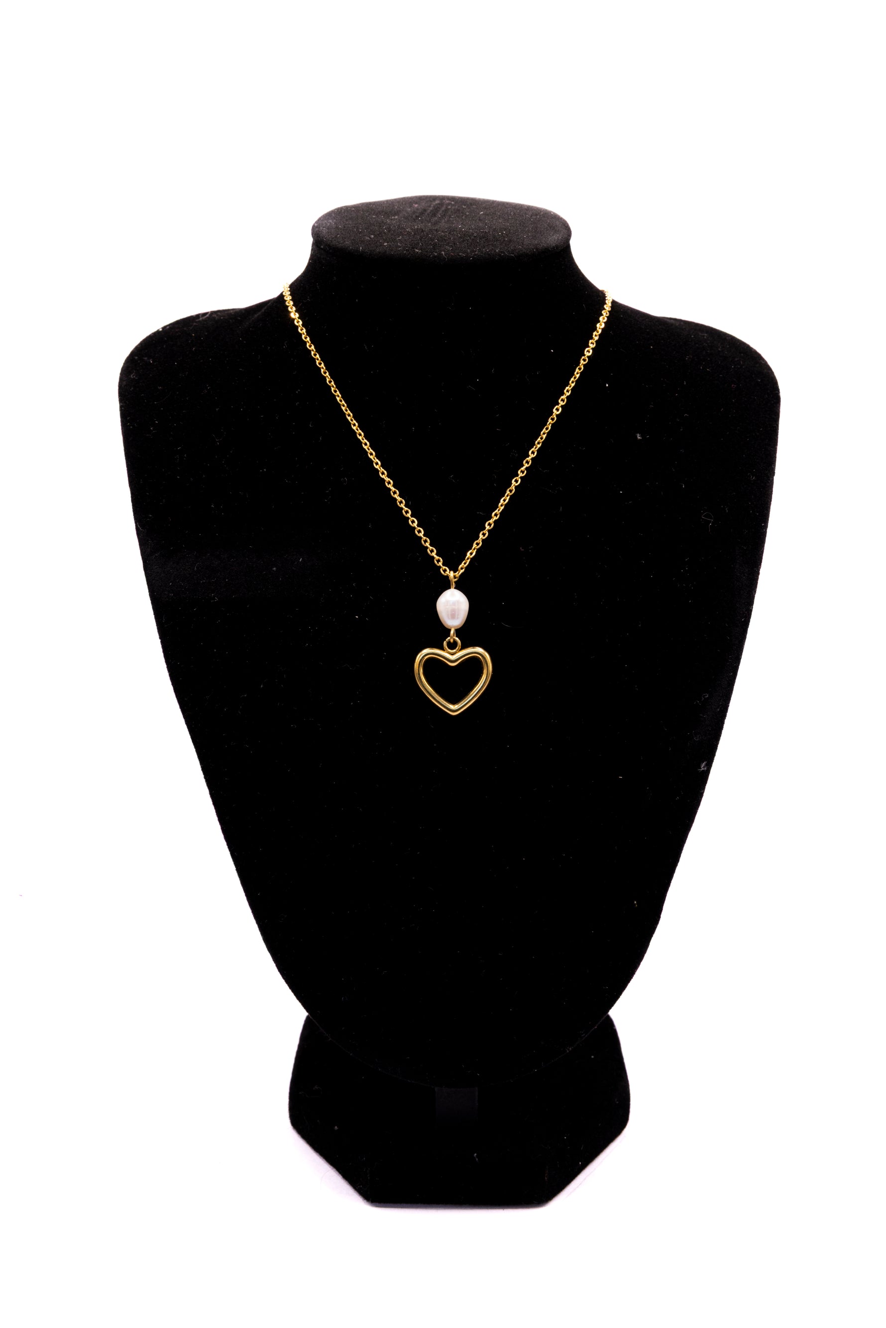 Son pendentif en forme de cœur doré enlace une perle d’eau douce suspendue, symbole de pureté et d’amour éternel.