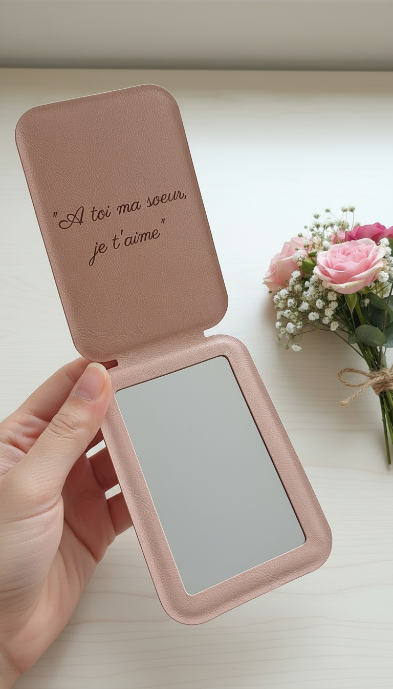 Ce pack délicat réunit un porte-clé personnalisé et un miroir de poche gravé, deux essentiels du quotidien transformés en souvenirs précieux.