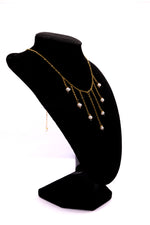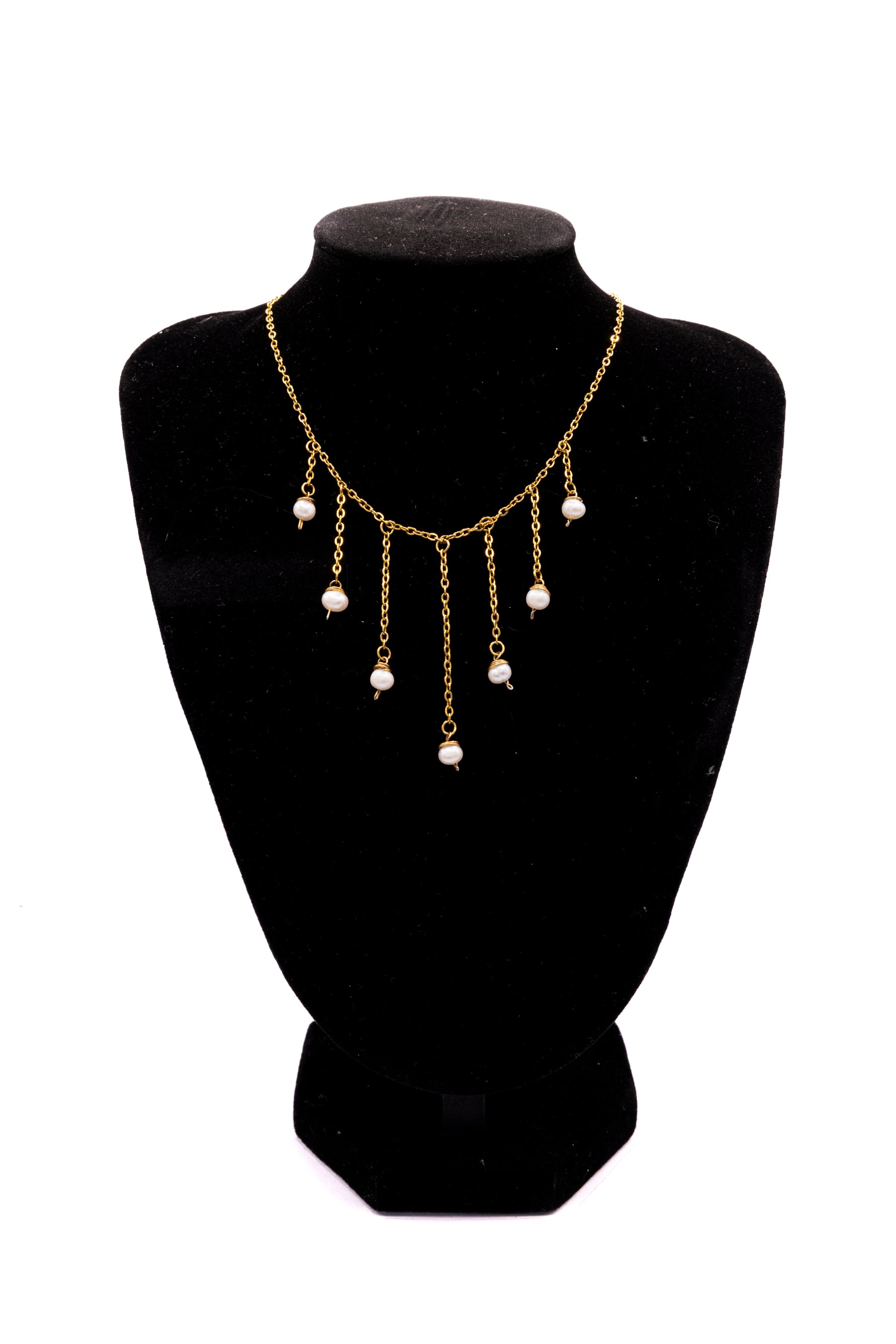 Sa chaîne dorée se pare de pampilles mobiles, chacune terminée par une perle d’eau douce véritable, naturelle et unique.