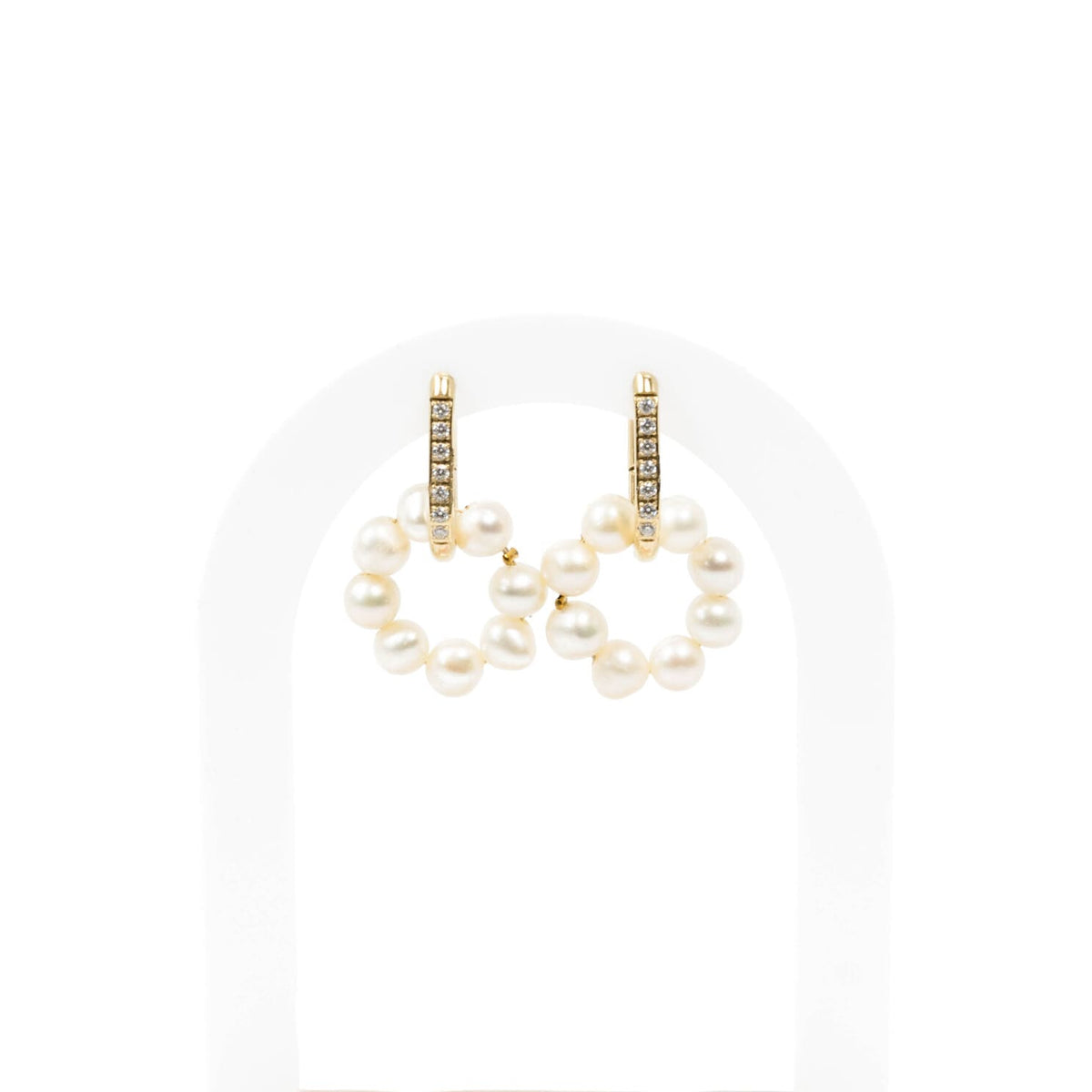 Chaque cercle de perles d’eau douce est suspendu à un anneau doré serti d’oxydes de zirconium, capturant la lumière à chaque mouvement.