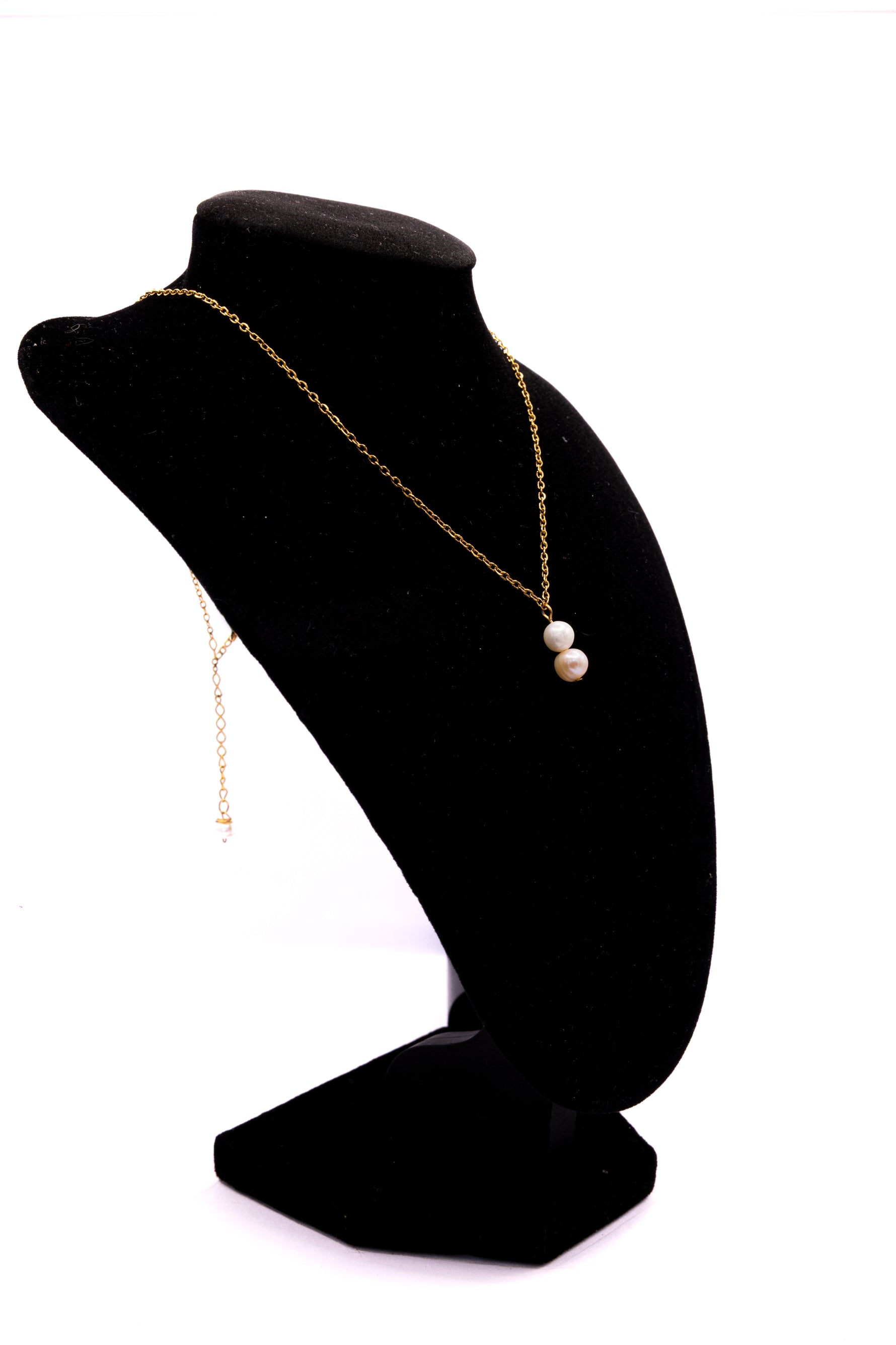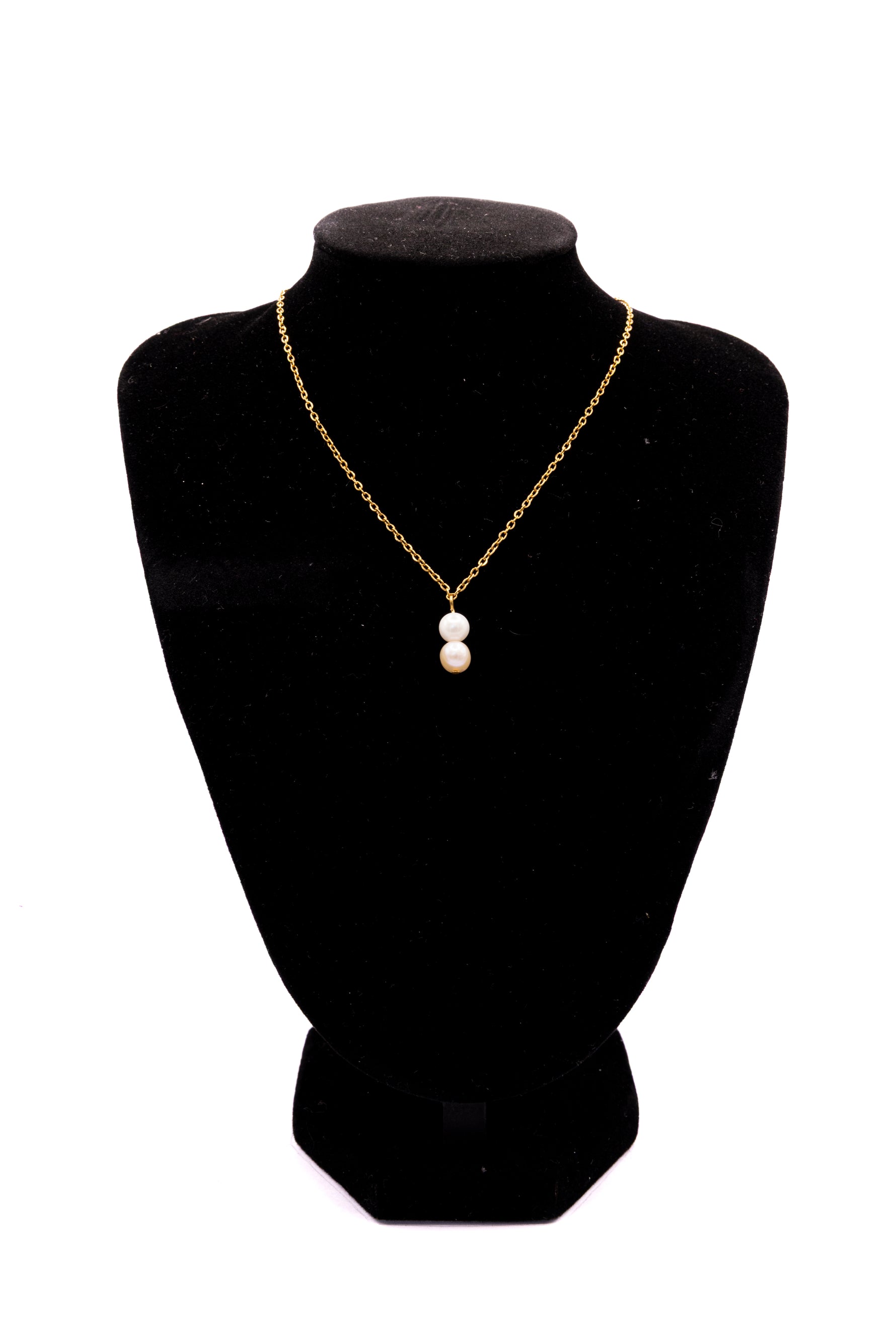 Le collier Alys séduit par sa composition épurée : deux perles d’eau douce véritables, soigneusement sélectionnées pour leur éclat nacré et leur forme naturelle, suspendues à une fine chaîne dorée en acier inoxydable 316L.