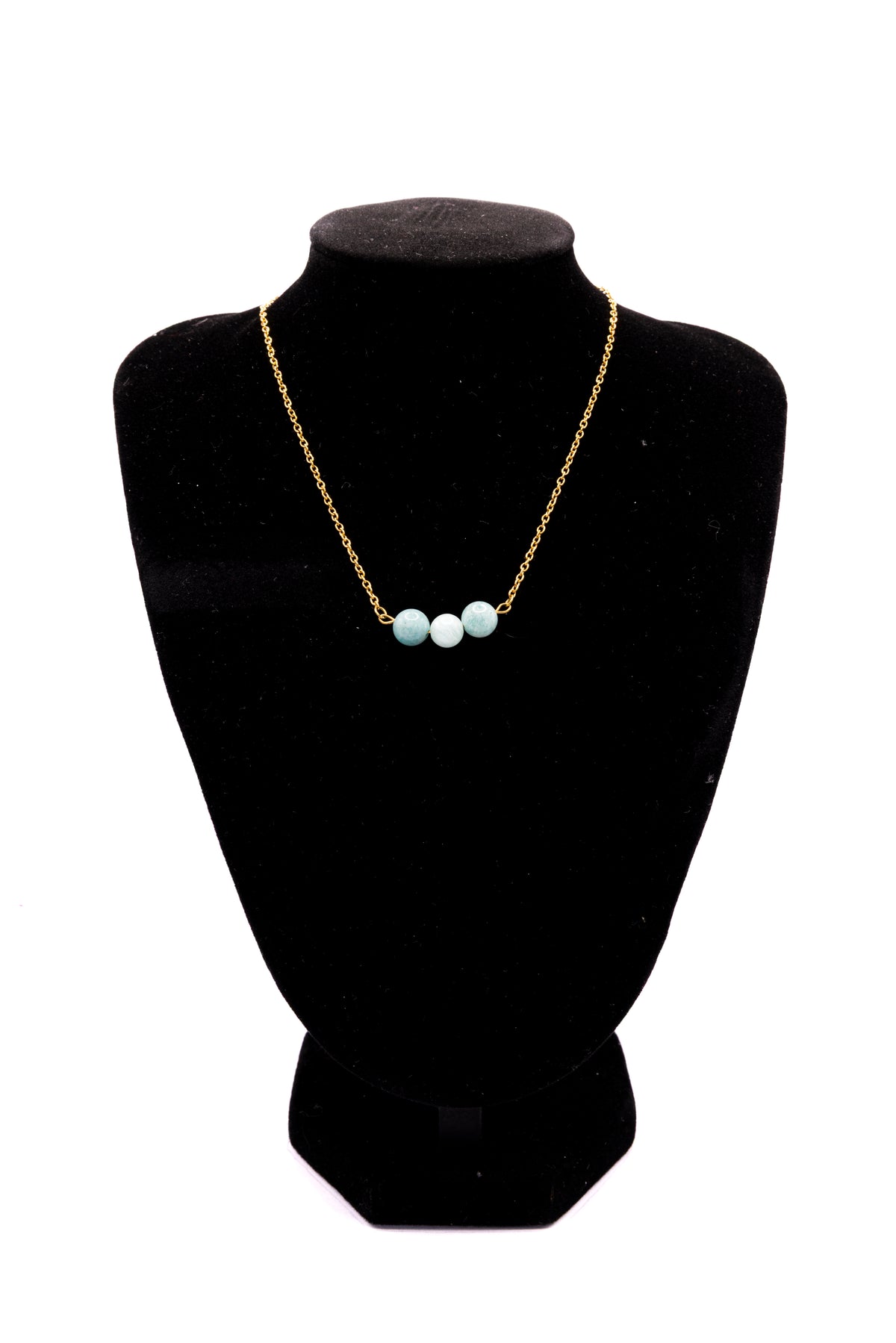 Ses trois perles bleu-vert, sélectionnées pour leurs reflets uniques, sont montées sur une fine chaîne dorée en acier inoxydable 316L.