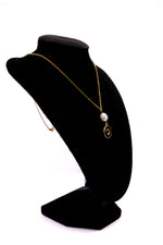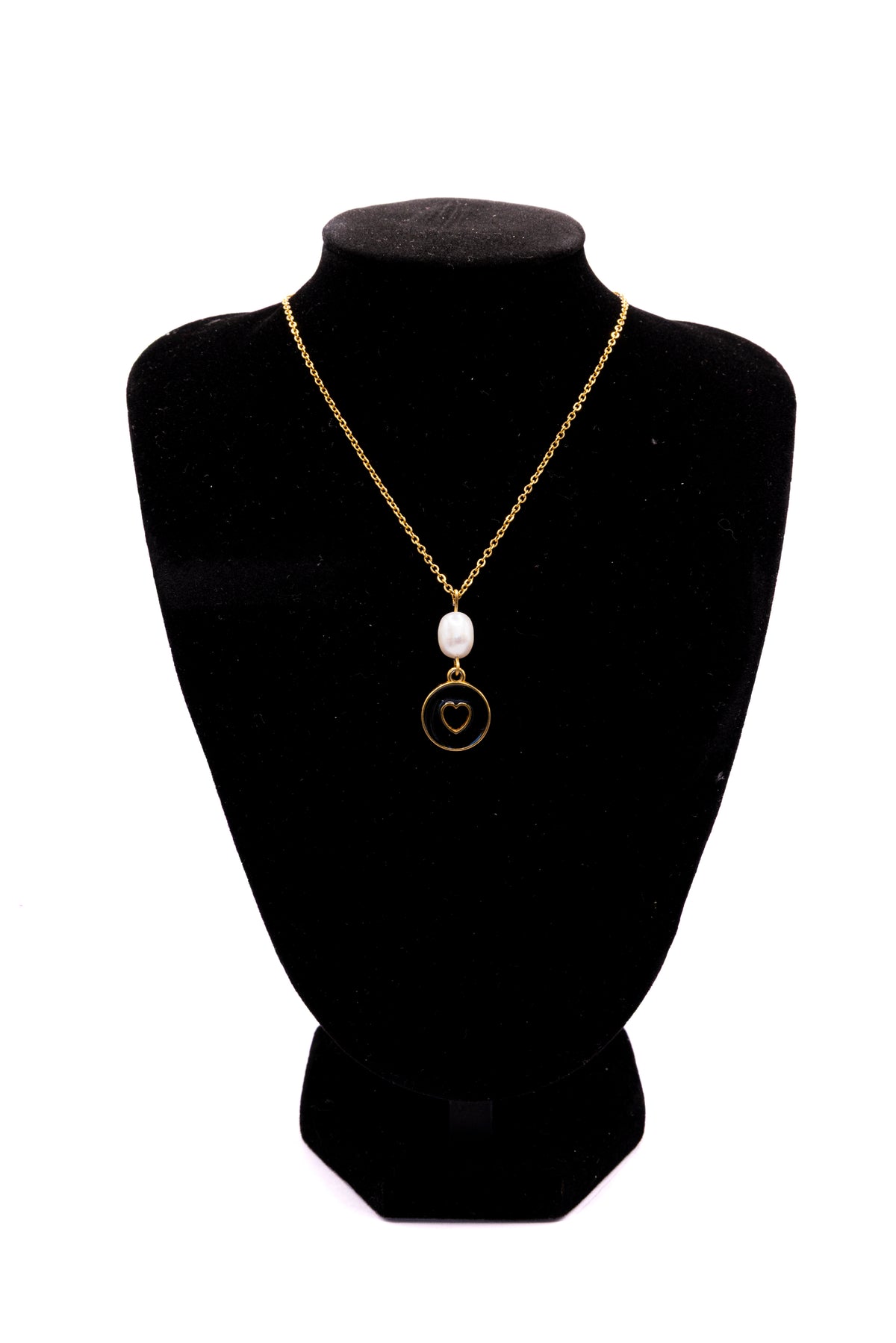 Une perle d’eau douce véritable, au reflet nacré unique, surplombe un médaillon doré en forme de cœur finement cerclé, créant un contraste harmonieux entre la nature et le bijou symbolique.