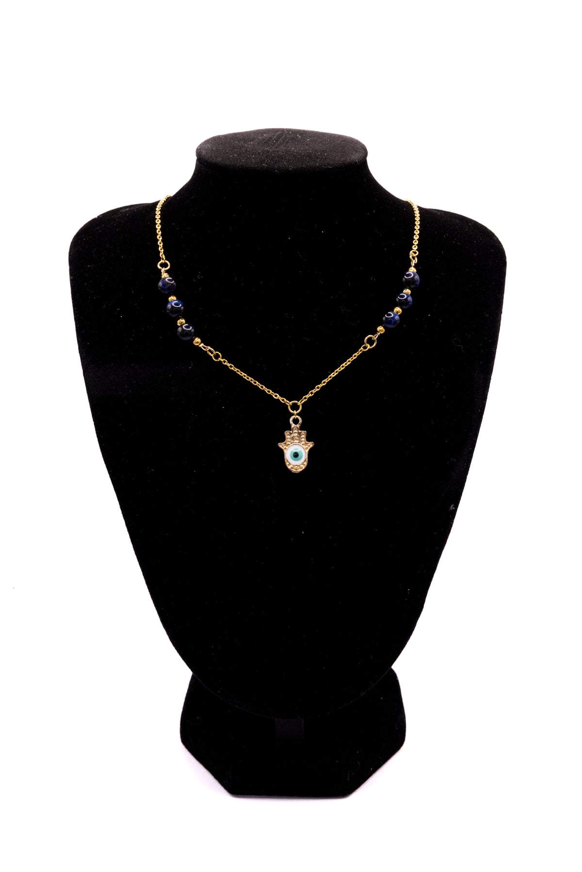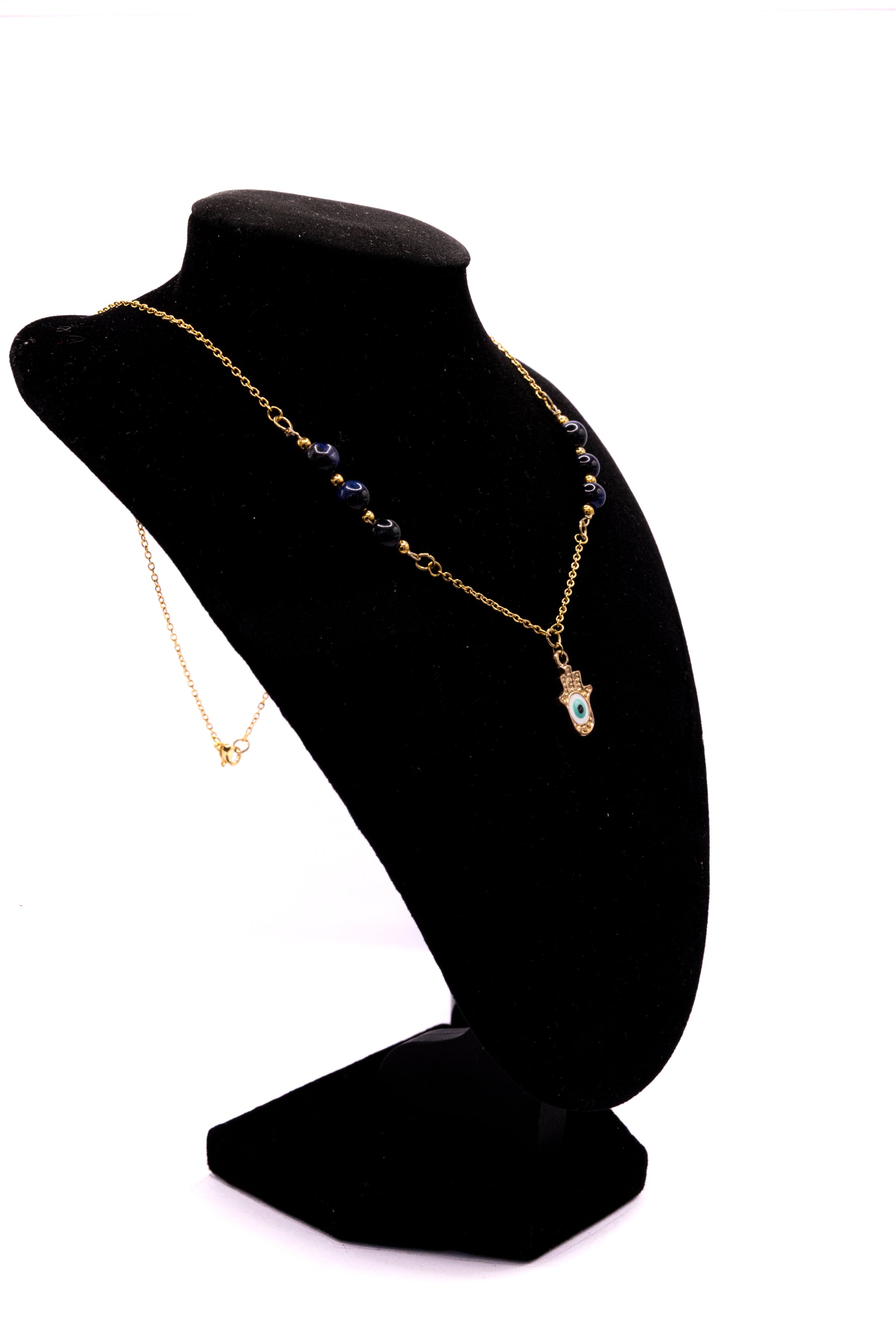 Son pendentif en forme de main de Fatma, symbole universel de protection, s’accompagne de délicates pierres bleues naturelles qui évoquent la sagesse, la paix et la vérité.