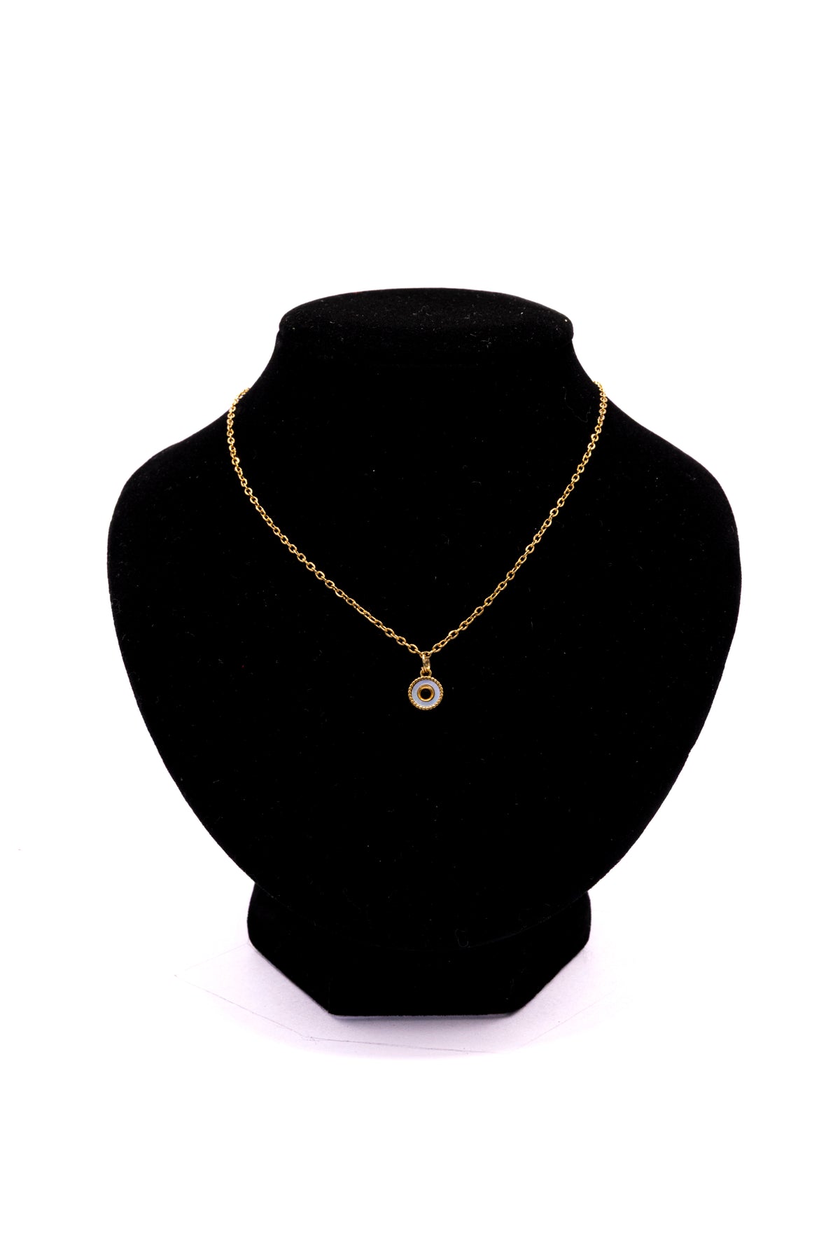Son pendentif rond, au cœur irisé, reflète subtilement la lumière et s’accorde à merveille avec la finesse de sa chaîne dorée en acier inoxydable 316L.